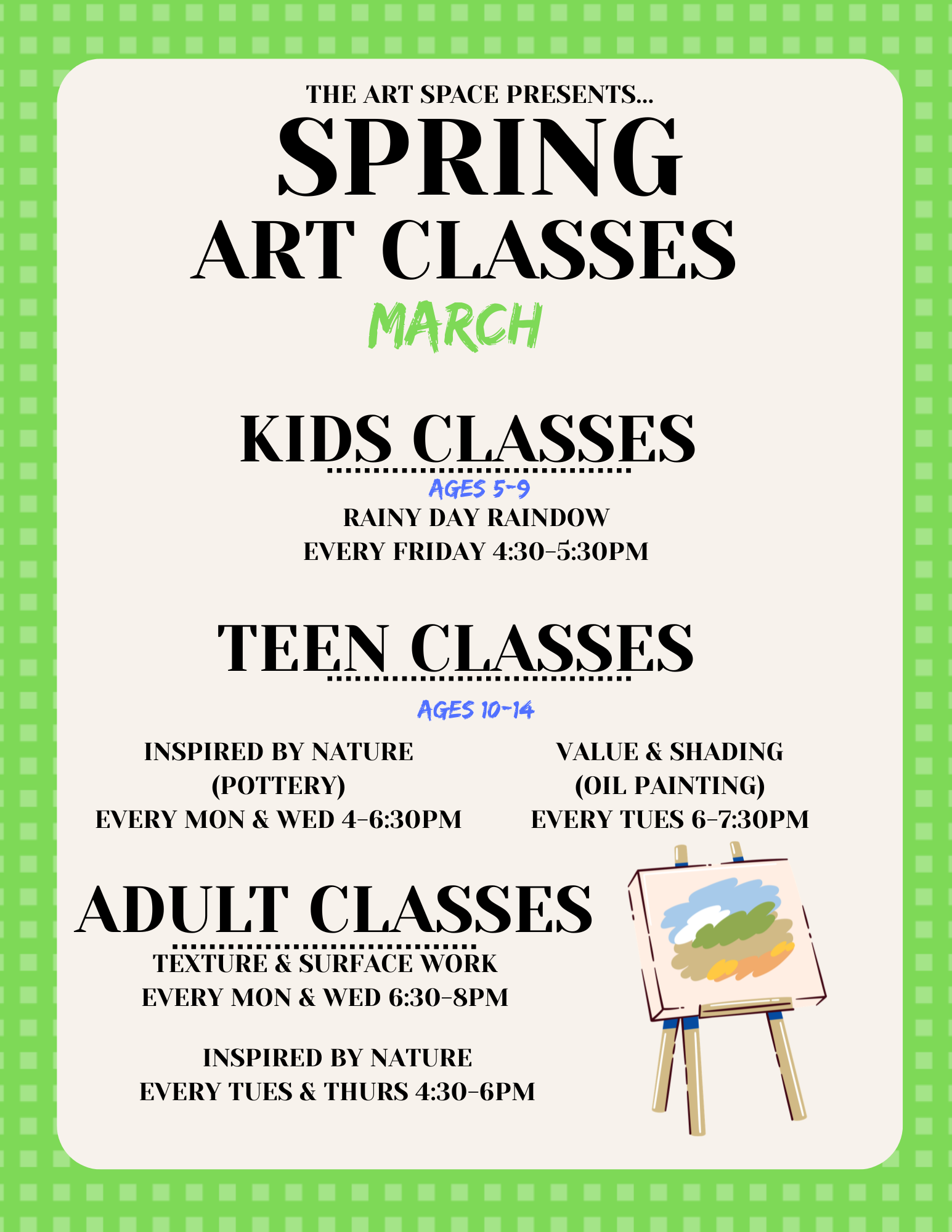 We’re excited to kick off a new month of creativity at The Art Space! Our March art classes are starting soon, and we can’t wait to see our students back in the studio creating, learning, and having fun.