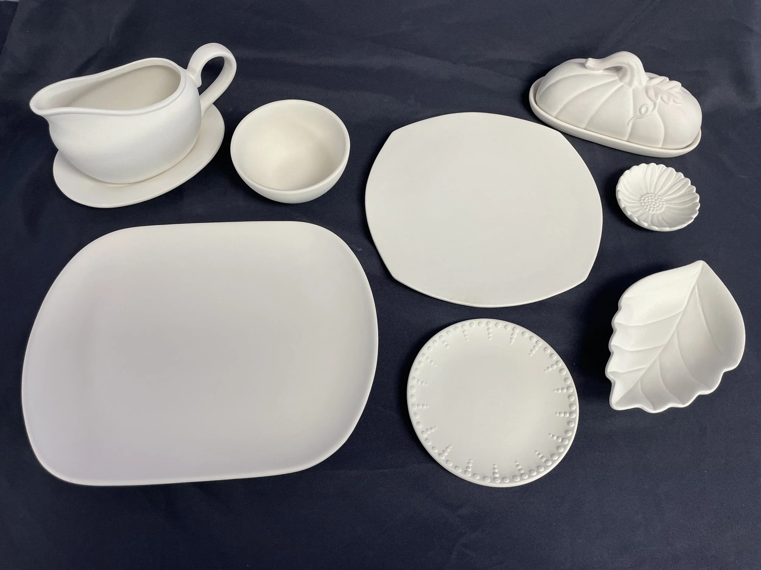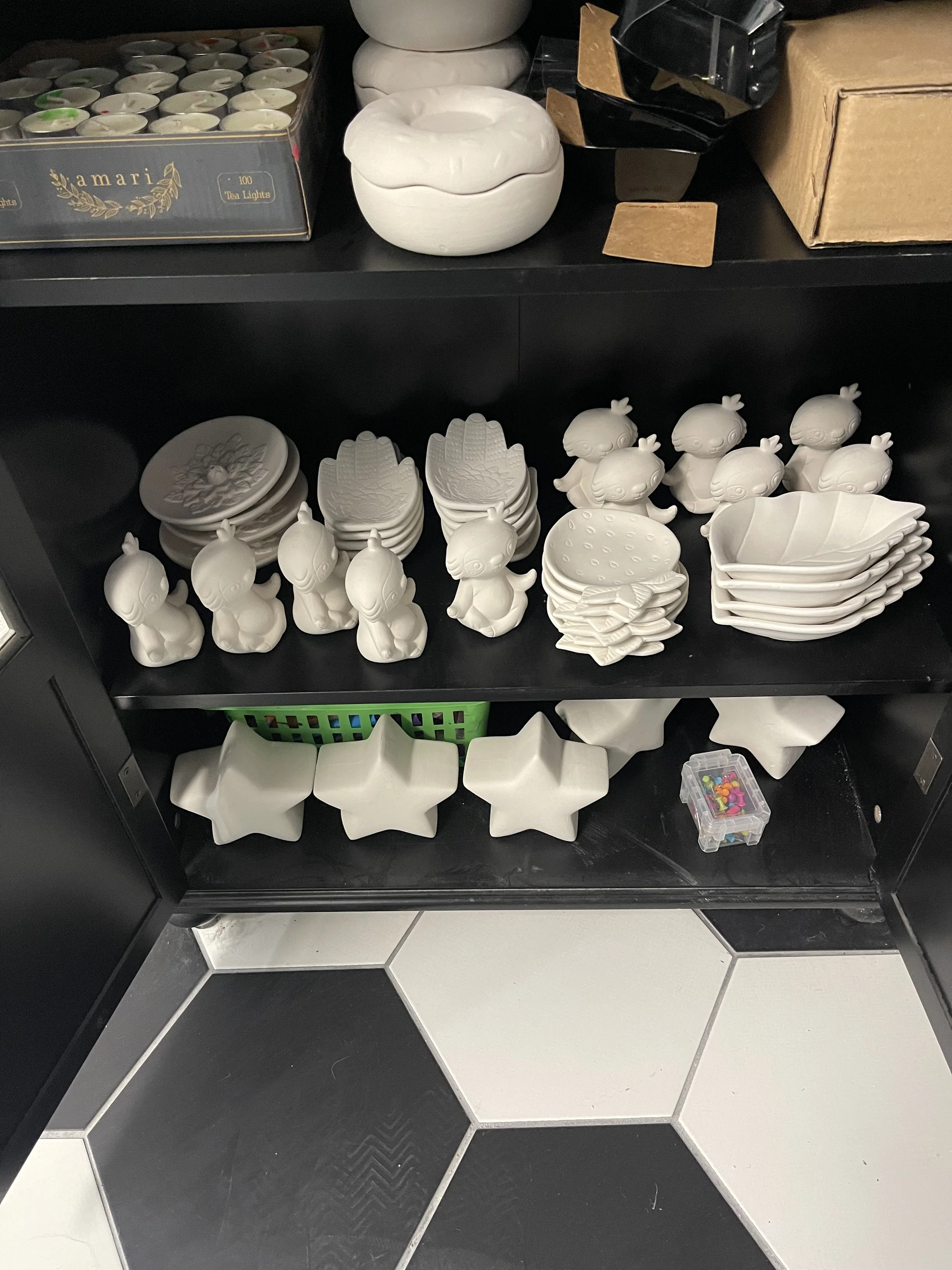 Select any of our interchanging bisqueware. Come decorate them using glaze or paints to make it your own.( If you use glaze it will take about 1-2 weeks for pick-up.)